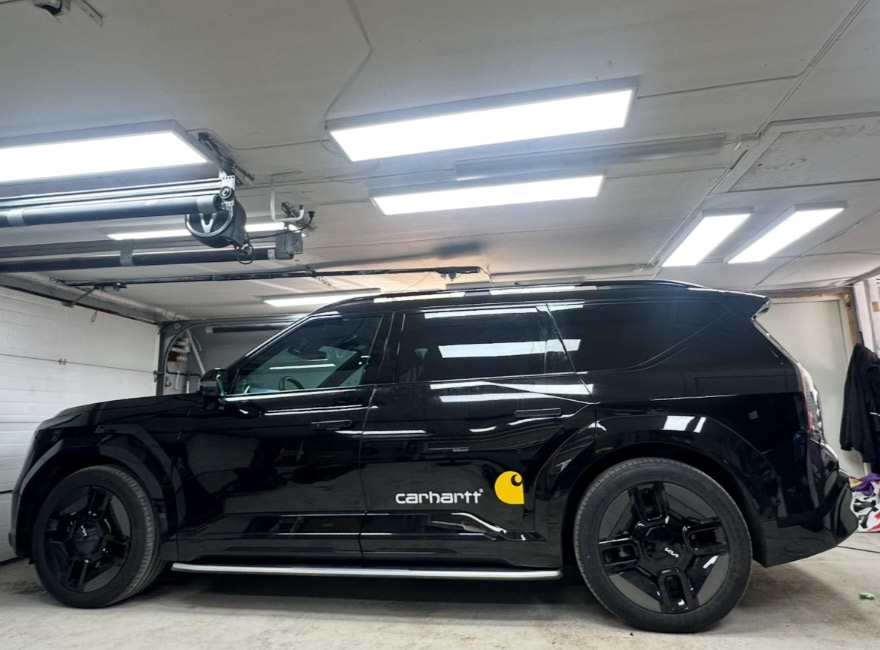 Diskret fordonsdekor med liten företagslogga på bakdörren, en elegant och modern bildesign som lyfter varumärket utan att ta över. Perfekt för företag som vill ha en stilren och professionell profilering av fordon.